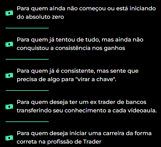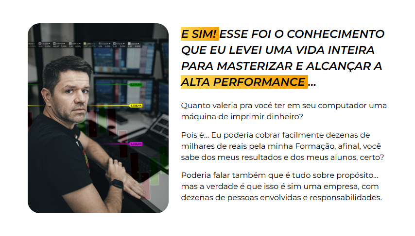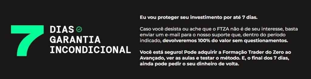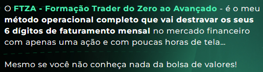 O FTZA – Formação Trader do Zero ao Avançado – é o meu método operacional completo que vai destravar os seus 6 dígitos de faturamento mensal no mercado financeiro com apenas uma ação e com poucas horas de tela…